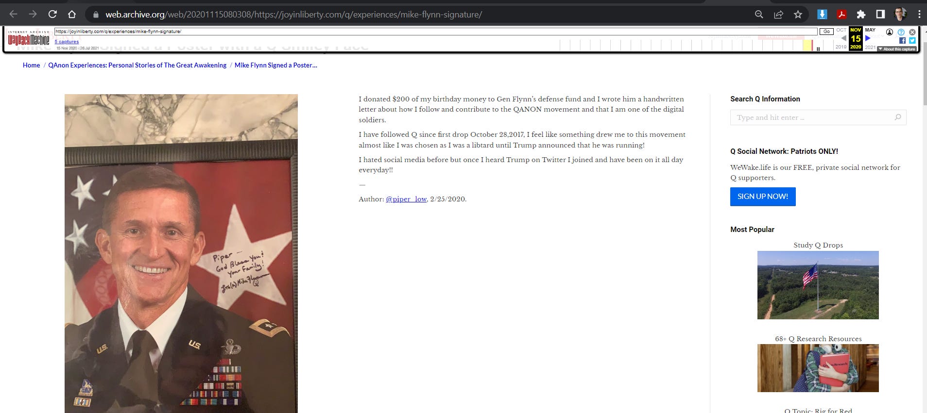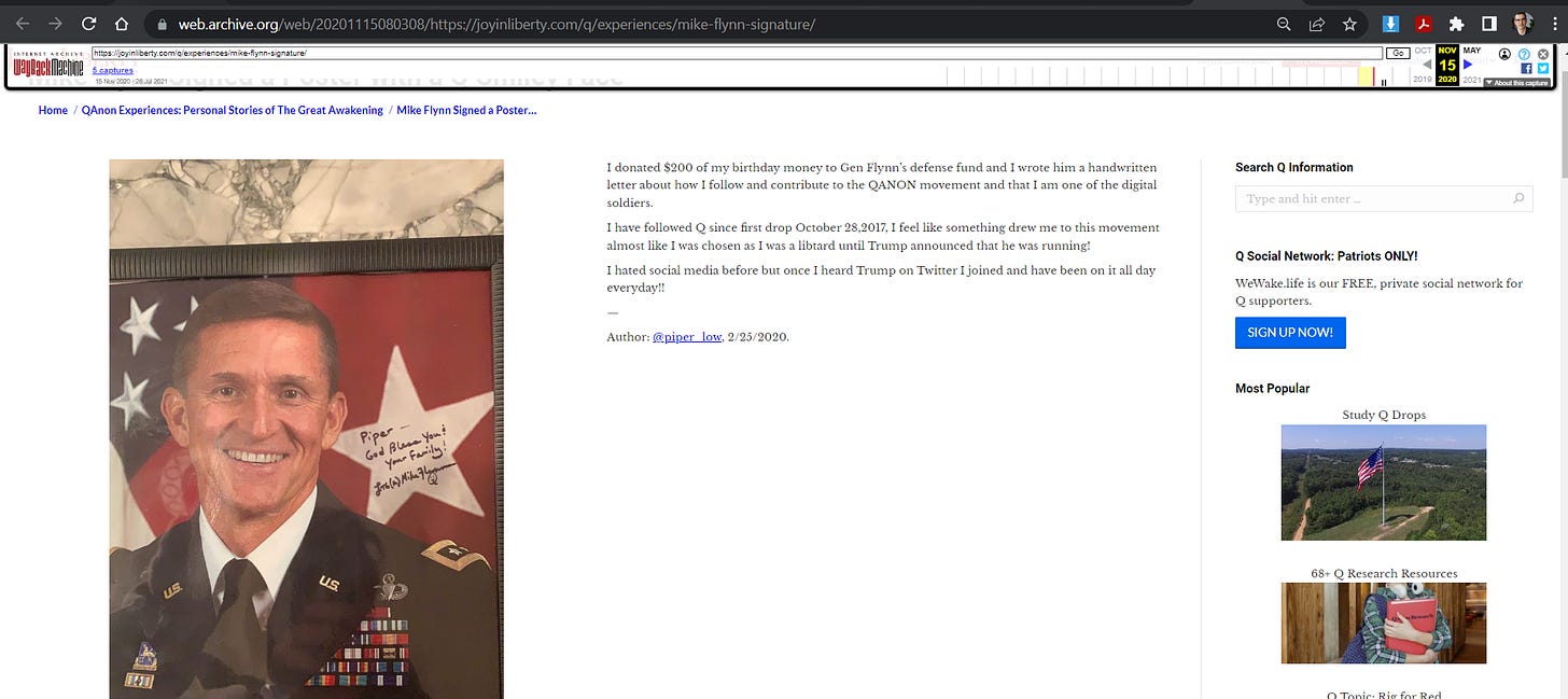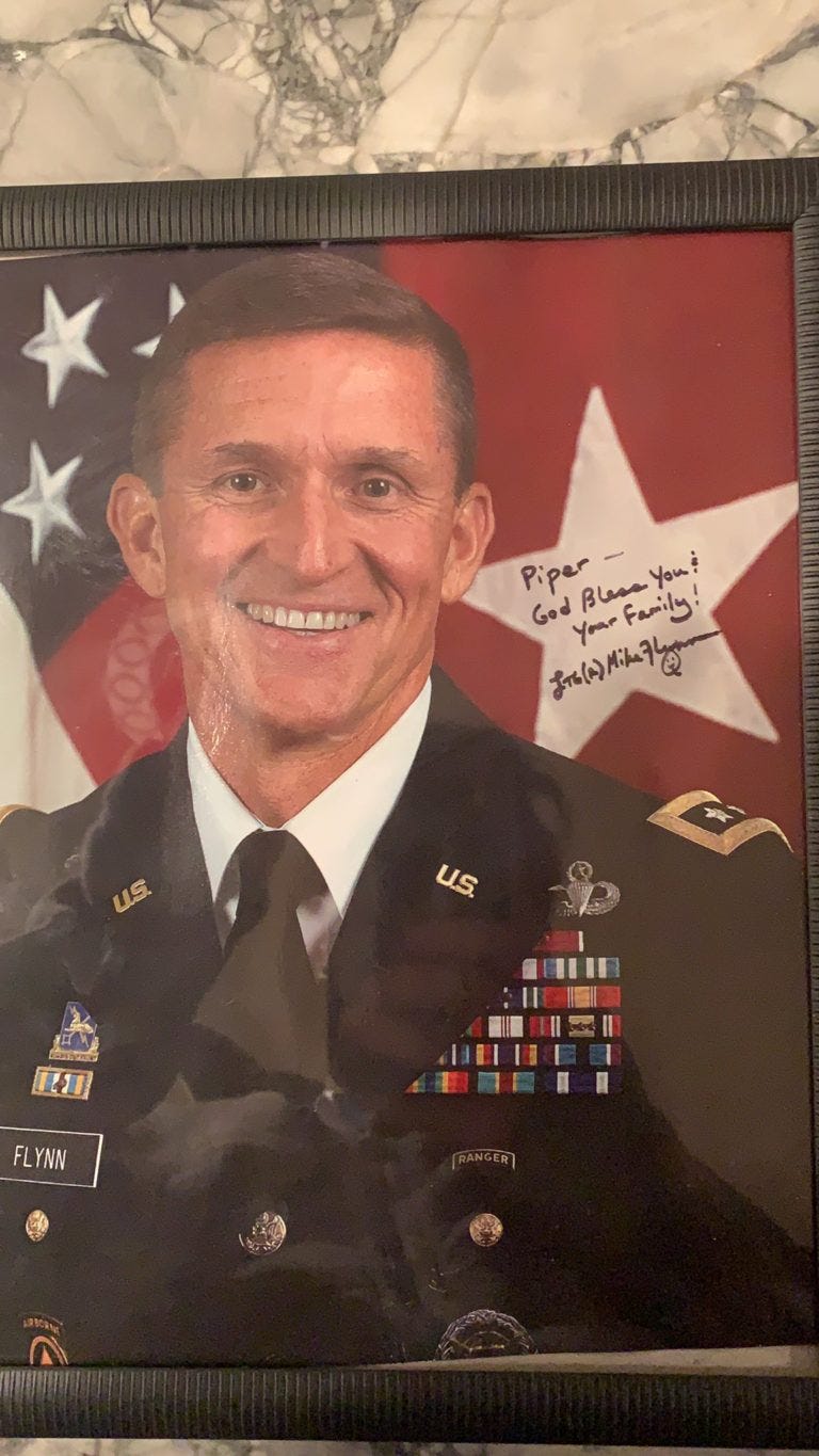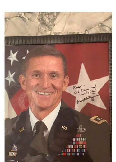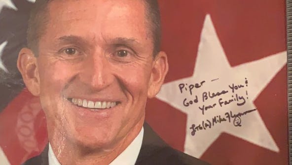 “Piper Low” says she donated $200 to Mike Flynn’s Defense Fund, wrote him a nice note about QAnon, and she received a signed photo in return.