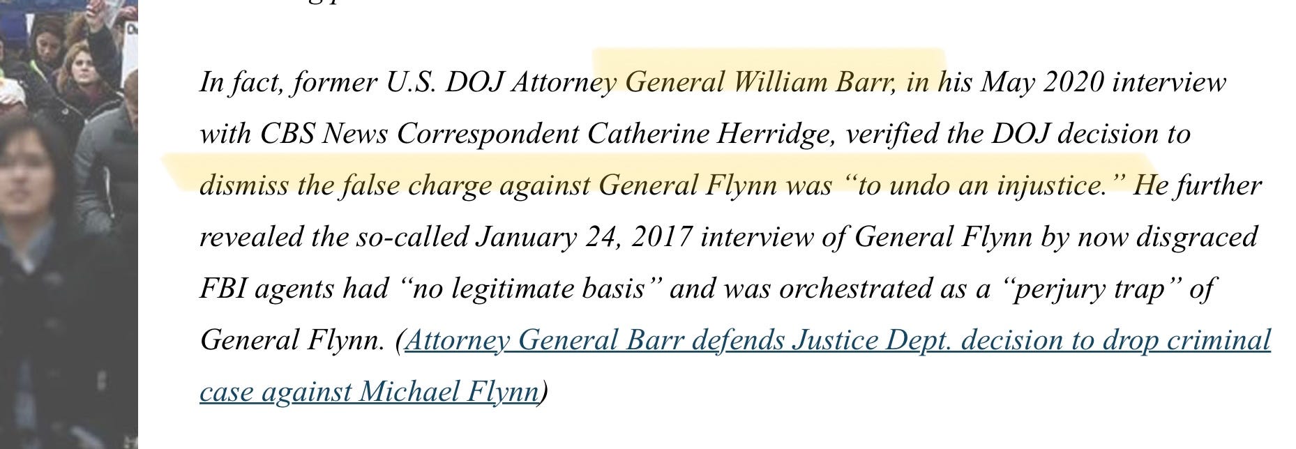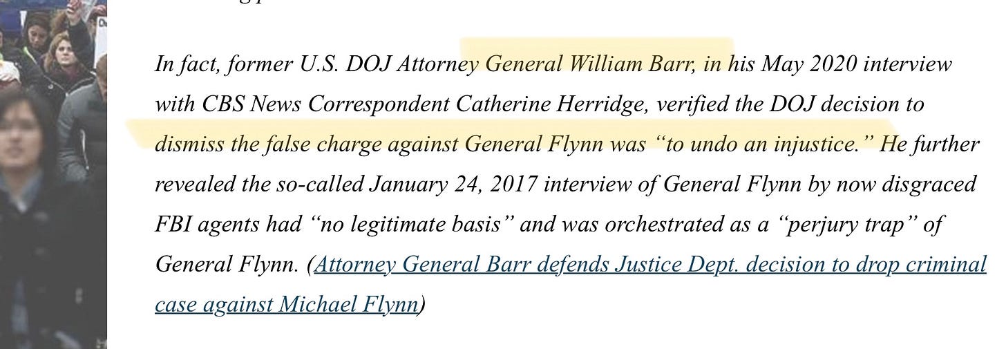 To top it off, Flynn appeals to the statement of the first and second most corrupt Attorney General in American history, Opus Dei member William Barr, to back up Flynn’s false claims that he was unjustly targeted.