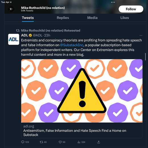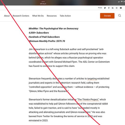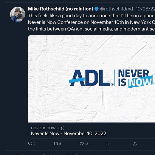 But Mike Rothschild, who has been attacking me since I DMed him in August 2020, wrote a series lies about me and included this Substack in an article about “antisemitism and conspiracy theories on Substack.”