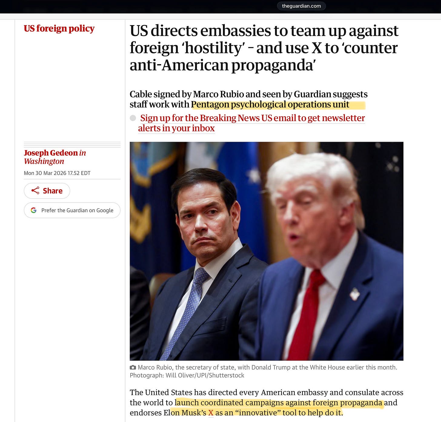 But now, according to a cable seen by the Guardian, Marco Rubio wants the Pentagon to run psyops directly on X—to “counter anti-American propaganda.”