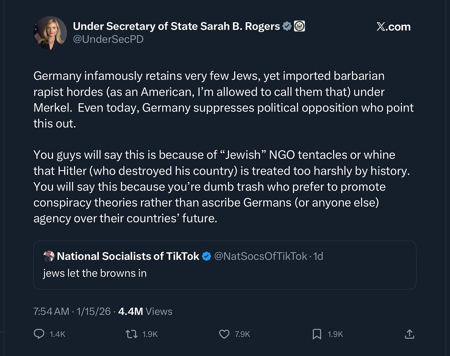 This is a real tweet by Sarah Rogers, responding unironically to a blatant Nazi account about whether Jews are at fault for letting “the browns in.” Does this seem like the right person to run psyops on X? Or to have a job in the government at all for that matter?