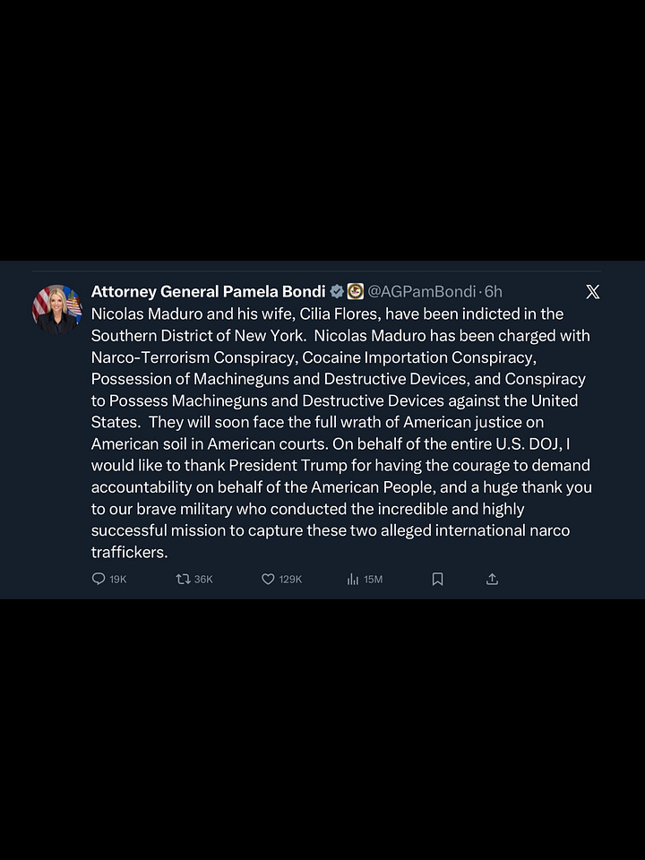 Despite Trump’s admission, Maduro was indicted by a grand jury in SDNY—an ironic venue choice given Trump’s own legal problems there—on a range of charges connected to alleged narco-terrorism, including “Possession of Machineguns and Destructive Devices”—a U.S. gun law from 1934.