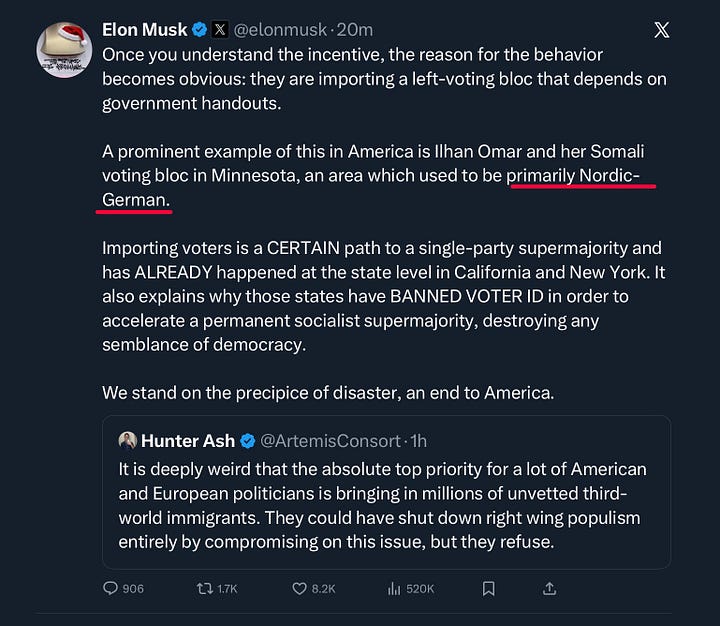 On Tuesday morning, Elon Musk—the most prolific promoter of white supremacy in the world—bemoaned the fact that Somalis have allegedly replaced a “primarily Nordic-German” area in Minnesota—and have the temerity to vote.