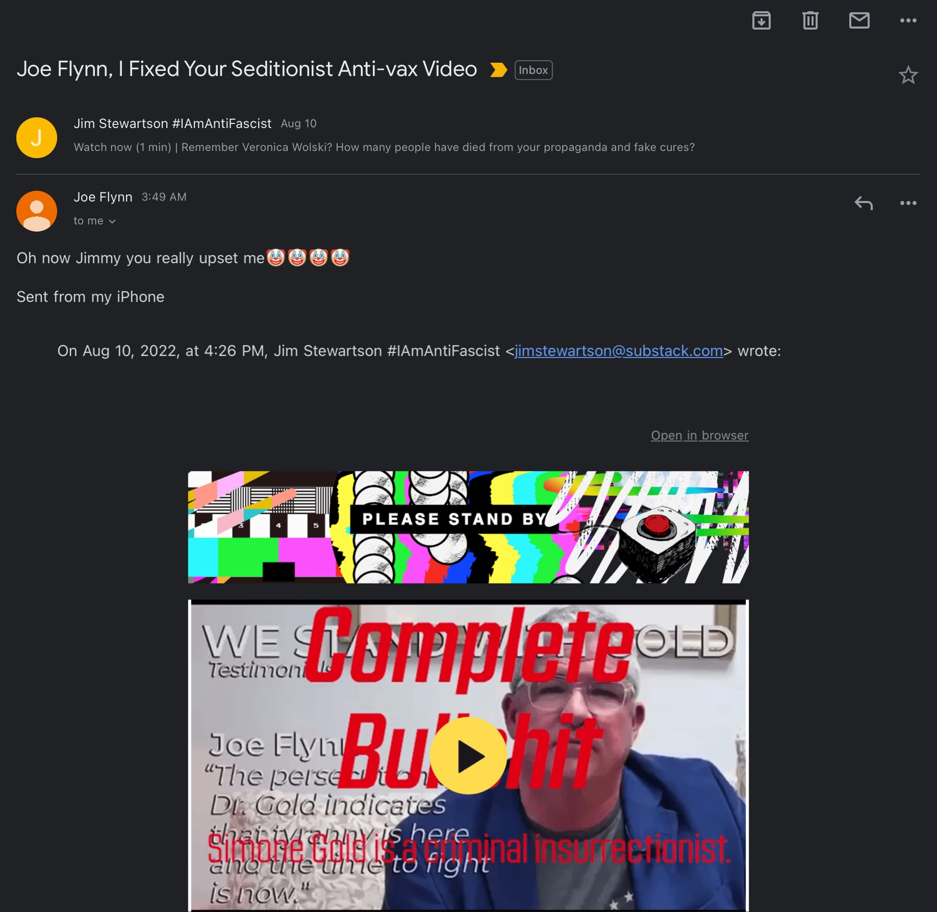 I edited a version of Joe Flynn’s seditionist anti-vax propaganda showing how Veronica Wolski, who used to spend her time on “The People’s Bridge” promoting Bernie Sanders, got sucked into QAnon by the Flynns and died because of their anti-vax propaganda.