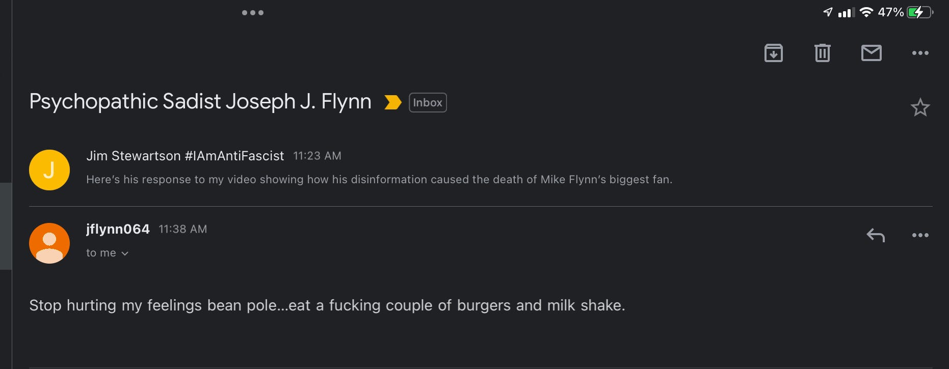 Here’s his response to my video showing how his disinformation caused the death of Mike Flynn’s biggest fan.