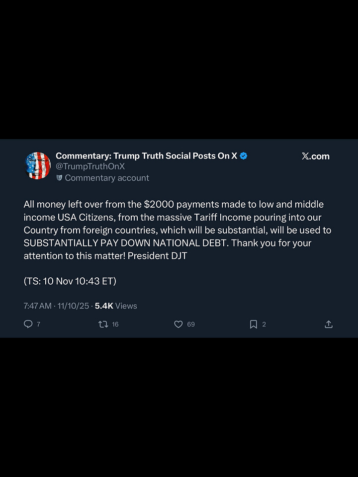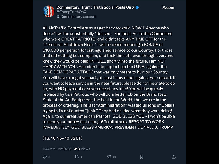 First, Trump wants to make a personal dividend of $2,000 per citizen from alleged “massive Tariff Income” and “SUBSTANTIALLY PAY DOWN NATIONAL DEBT” with whatever is “left over.” Second, he threatens air traffic controllers who have been working for 40 days with no paycheck—and offers a $10,000 loyalty payment for “GREAT PATRIOTS” who stood firm against the “FAKE DEMOCRAT ATTACK” of shutting down the government.