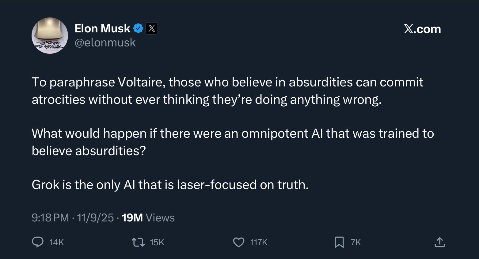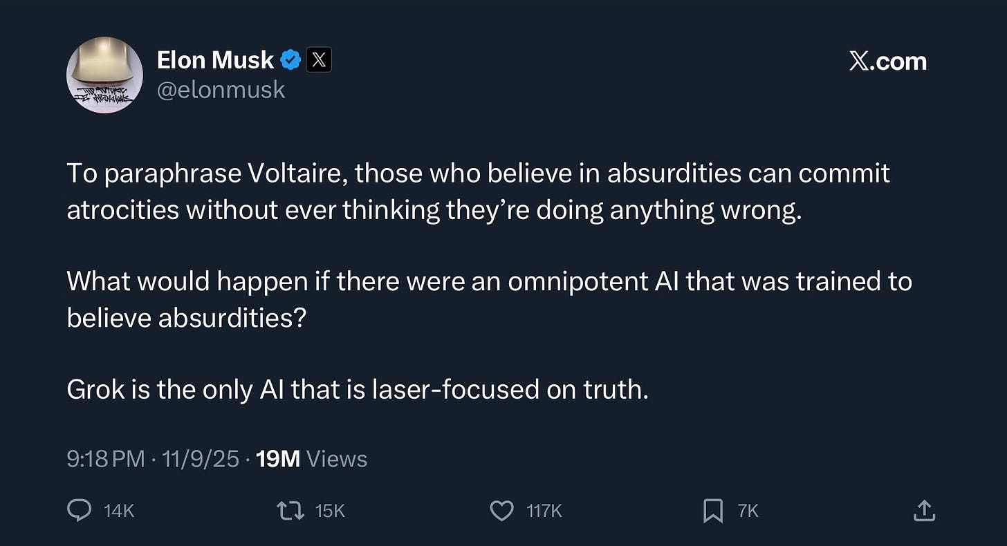 Monday morning Elon Musk attempted to “paraphrase” Voltaire’s quote, by completely inverting it. Here, Musk positions himself as the First Estate—the technocratic clergy—by peddling actual absurdities.