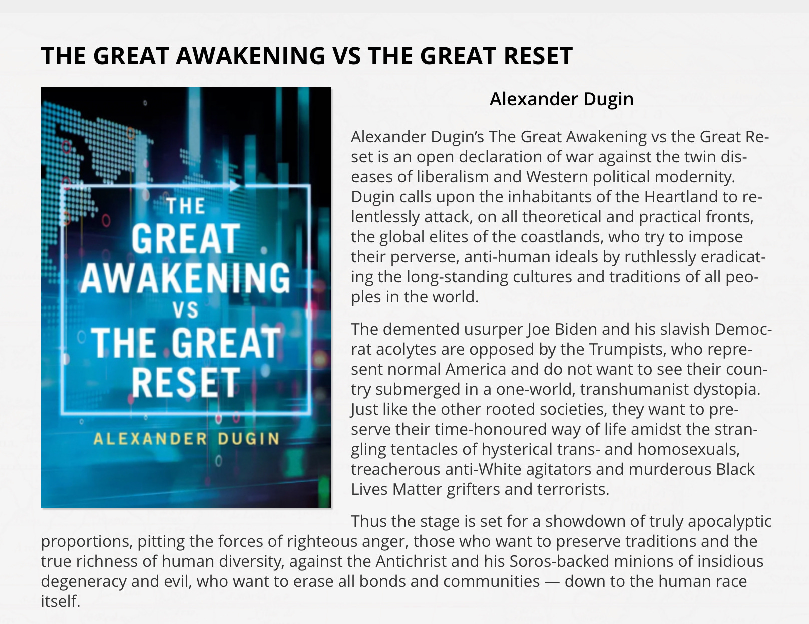 Trump’s “TRUTH” is, in both style and substance, a recapitulation of a strategy laid out by “Putin’s Brain” Aleksandr Dugin over three years ago in his book “The Great Awakening vs. The Great Reset.”