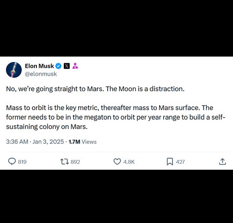In 2025, Musk reaffirmed: “we’re going straight to Mars. The Moon is a distraction.”