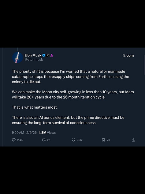 For a quarter of a century, South African immigrant Elon Musk has promoted the narrative that humanity must become “multi-planetary” in order to “preserve the light of consciousness.” This has been his central argument for investors and the federal government to give SpaceX billions of dollars to “Occupy Mars.”