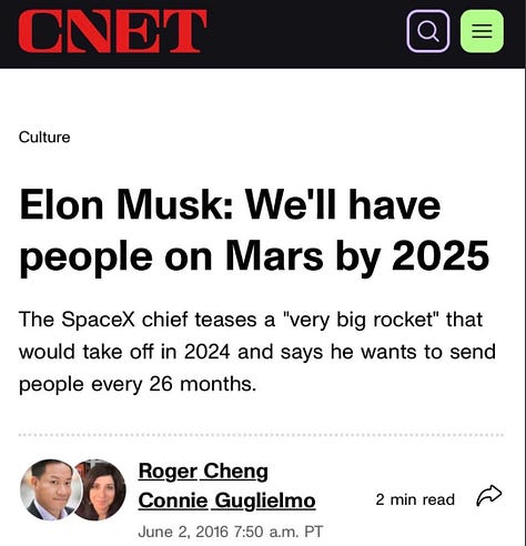 In 2016, Musk predicted he would have people on Mars by 2025.