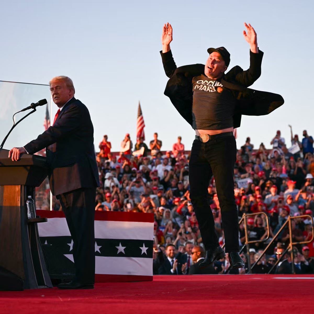 Mars has also been a repeated narrative in Musk’s relationship with Trump, who, depending on whether Elon was in the doghouse or not, repeated the Mars fantasy on numerous occasions. Musk wore his “OCCUPY MARS” t-shirt at one infamous event, where he was reportedly extremely high on ketamine.