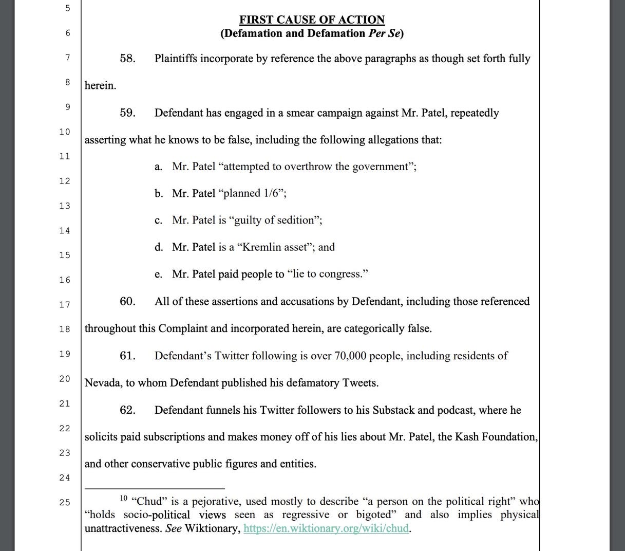 While I have not been served with his frivolous defamation suit, Kash Patel’s complaints include that I called him a “chud” — which is conveniently linked in a footnote for a definition — and that I called him a “Kremlin asset.”
