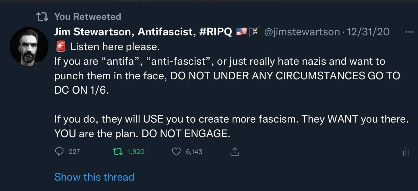 On January 5th, 2021, the first Trump regime posted Memorandum on Inadmissibility of Persons Affiliated with Antifa Based on Organized Criminal Activity. This was a conscious move to cast “Antifa” as “organized criminal activity” to blame the left for the violence that was coming the next day. As a close observer, I saw what they were planning to do well before January 6th.