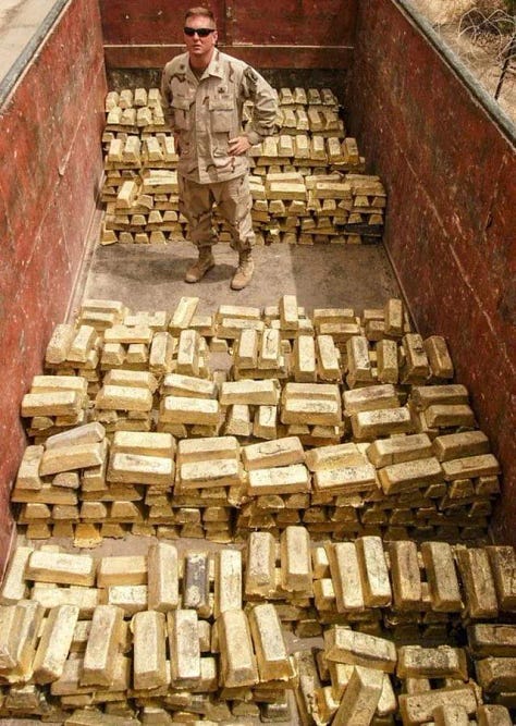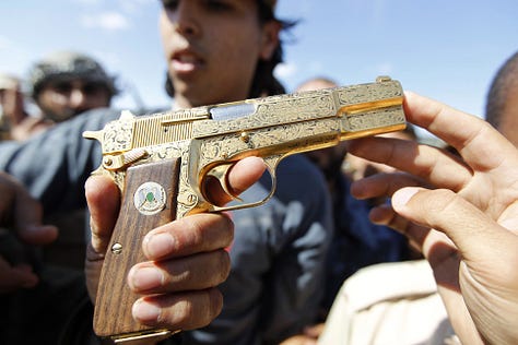 Saddam’s gold chair, gold-leaf pillars, Marine with some of Saddam’s gold. Muammar Gaddafi hoarded and stole untold billions of gold and diamonds, and as his regime toppled managed to ship a fifth of Libya’s gold… somewhere. It still hasn’t been found—which is quite a story. Gaddafi, like the rest, lived in golden palaces, wore golden clothes, and gilded his possessions, and surroundings.