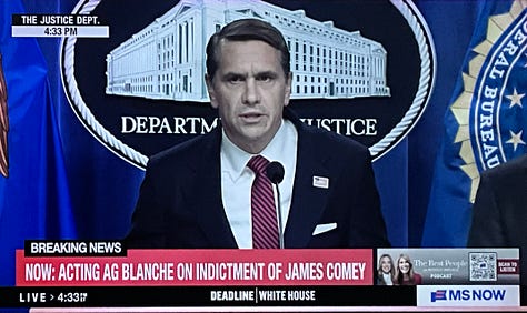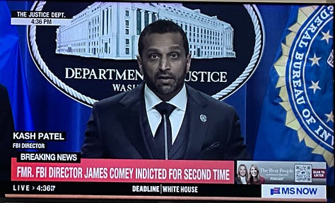 And finally, as I write this, the same DOJ is doing a press conference to indict James Comey for the second time for posting a picture of rocks spelling out “86 47.”
