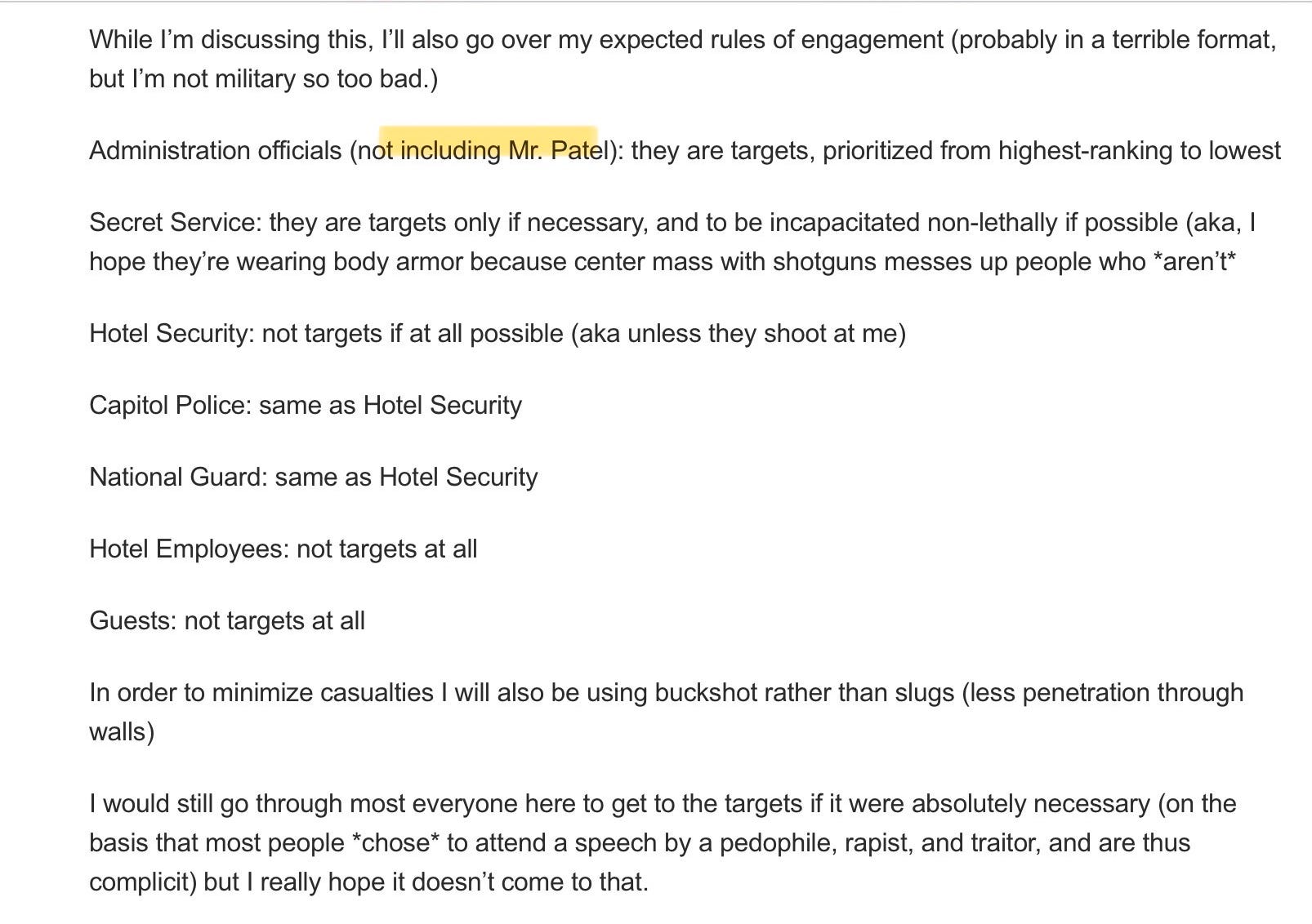 Just before the event, Allen sent a manifesto to his family which gave his motivation as a “friendly federal assassin” and laid out his political targets including Trump (“a pedophile, rapist, and traitor”)—but for some reason excluded “Mr. Patel.”
