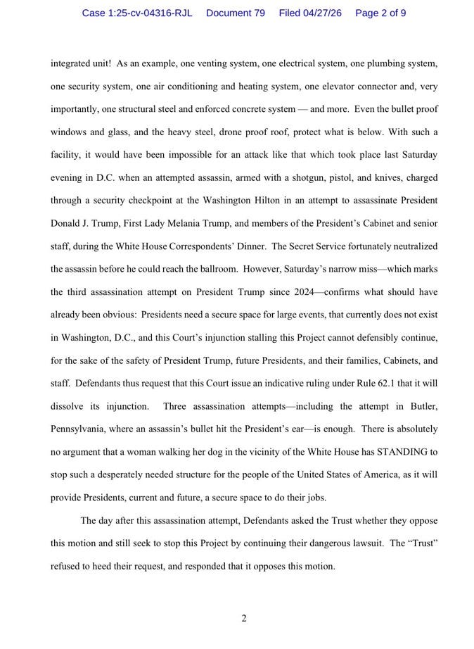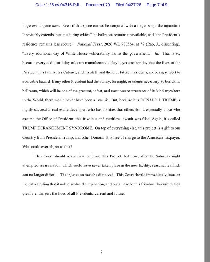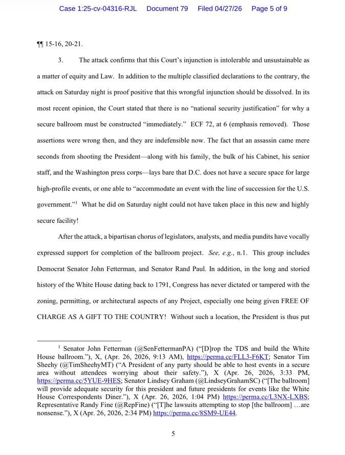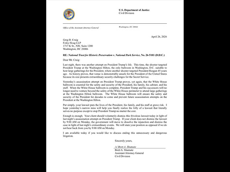 The DOJ also publicly leaned on the plaintiff in a lawsuit currently holding up construction of the ballroom—calling it “dangerous litigation” because Trump won’t have a safe space. And numerous regime officials have used their platforms to sell the ballroom as a solution to the epidemic of Cole Allens—despite the fact that the event could not have been held in a government building.
