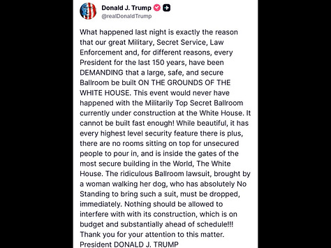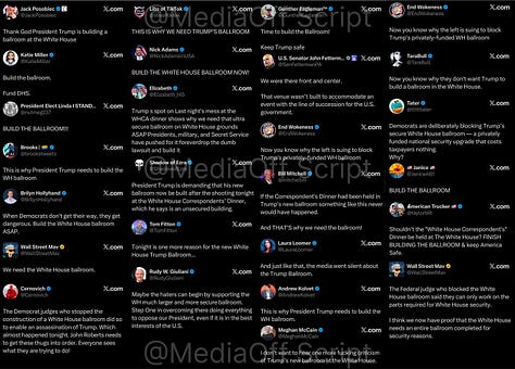 Within minutes of the incident, where security mostly worked as designed, nearly the entirety of Trump’s propaganda operation simultaneously started calling to build the White House ballroom—because obviously it’s needed for security.