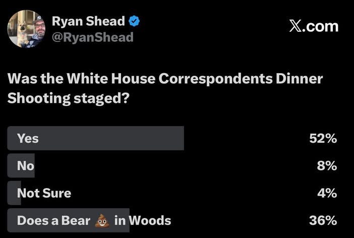 Cole Allen’s actions were not technically a PSYACT, because they were not planned by the regime. But they were near-perfect PSYACT material: a real violent event useful to drive a narrative, except for the Secret Service agents shooting each other. That part did not create a compelling story—so they simply left it out. In a sufficiently sealed information bubble, a panoptic regime can do this kind of information alchemy on almost anything.