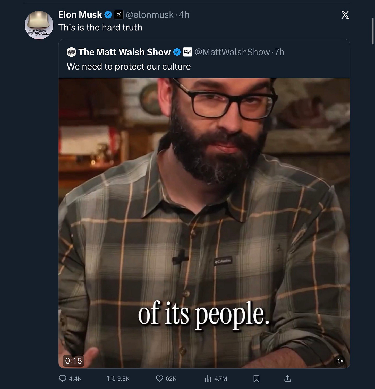 In the video below shared by Musk as the “hard truth,” Matt Walsh makes the argument that “our culture”—meaning white people—are intrinsically better than Somalians and therefore we shouldn’t let them live here. This is the hard truth about the current ruling class. We’ve let them get too big for their britches.