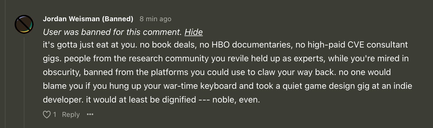 You can't allow them to engage you. They are trying to get your goat and create a reaction. The best thing you can do is not engage. Hoping you get a patreon account with HiFi and Sean & Heidi.