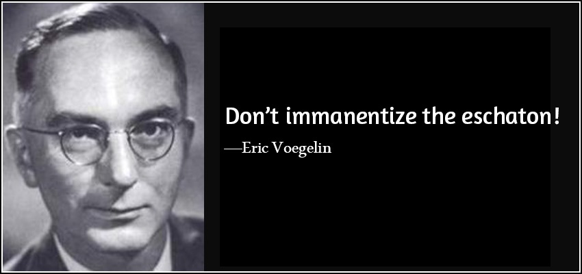 Perhaps Voegelin’s most famous phrase is: “Don’t immanentize the eschaton!” This means in basic terms that you shouldn’t try to make the end of the world (the eschaton) concrete (immanent). This slogan was used by people like William Buckley to make political points for many years, but Voegelin meant something deeper. He meant you shouldn’t try to find spiritual transcendence inside the bounds of history.