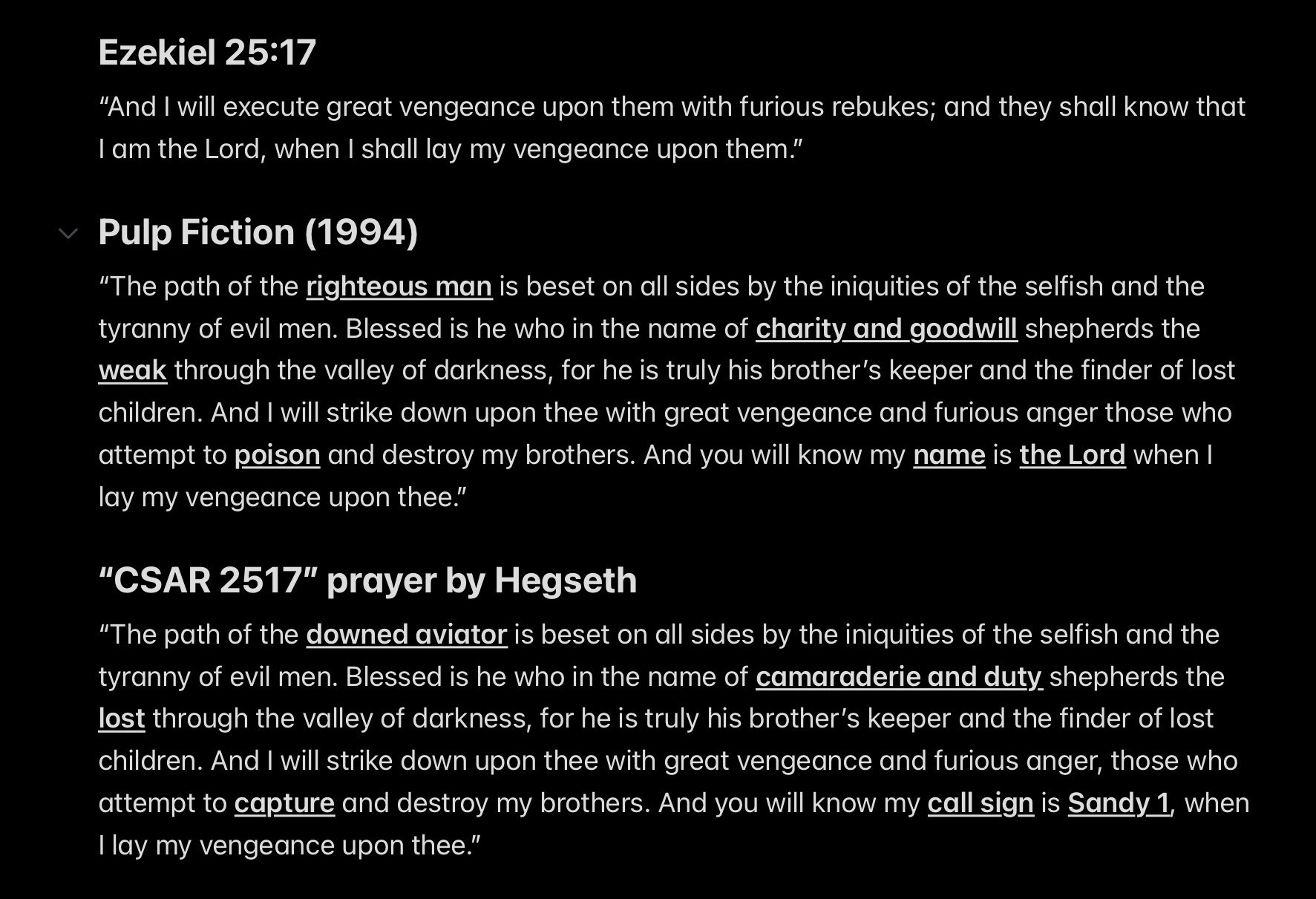 Hegseth’s prayer had almost no connection to the Bible verse he cited. Instead, it turns out the prayer was actually Samuel L. Jackson’s terrifying monologue in Pulp Fiction (1994) with a few slight changes.