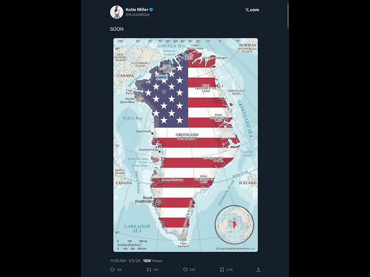 Just after the Trump regime invaded Venezuela and captured its president, Stephen Miller’s wife Katie—who works for Elon Musk—tweeted a threat to Greenland, which is the territory of Denmark, a NATO nation.