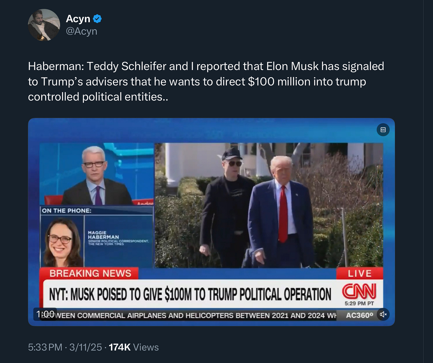 It’s also being reported that Elon Musk is telling his advisors to send Donald Trump $100 million, which I’m sure is a coincidence.