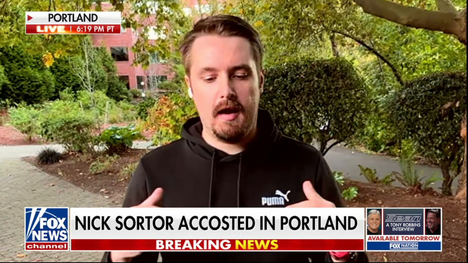 Nick Sortor is a prolific Twitter poster and provocateur who travels to “conflict zones,” like peaceful Portland, to piss off local residents and then record it as evidence of his victimhood.