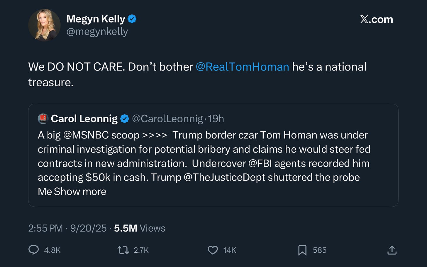 Yesterday, along with the blatant attempt to dismantle the First Amendment, came the revelation by MSNBC that Border Czar and head of the ICE gestapo, Tom Homan, was caught on video last year taking $50,000 from FBI agents to help them win contracts in the Trump administration—a flat-out bribe. Unsurprisingly, Kash “Valhalla” Patel shut down the investigation at FBI for lack of “credible evidence.”