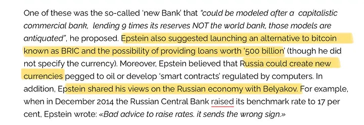 Epstein’s influence extended beyond politics into geopolitics and the financial system. He was on a mission to help Putin subvert the United States, including setting up an “alternative to bitcoin” called “BRIC” over a decade ago.