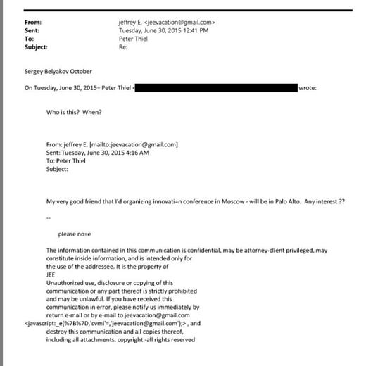 Peter Thiel met with Epstein’s Kremlin handler Sergey Belyakov in 2015—the year before Thiel and the Russians cooperated on covert operations in 2016 that swung the election to Donald Trump. Many of those operations involved painting Hillary Clinton and the Democrats as pedophiles.