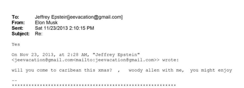 In November 2013, of all the people in America, perhaps the two most famous pedophiles were Jeffrey Epstein and Woody Allen, who married his wife’s adopted daughter, Soon Yi. After Musk had ingratiated himself to Epstein in search of parties for months, Epstein invited Musk to the Caribbean at Christmas—with Woody Allen.