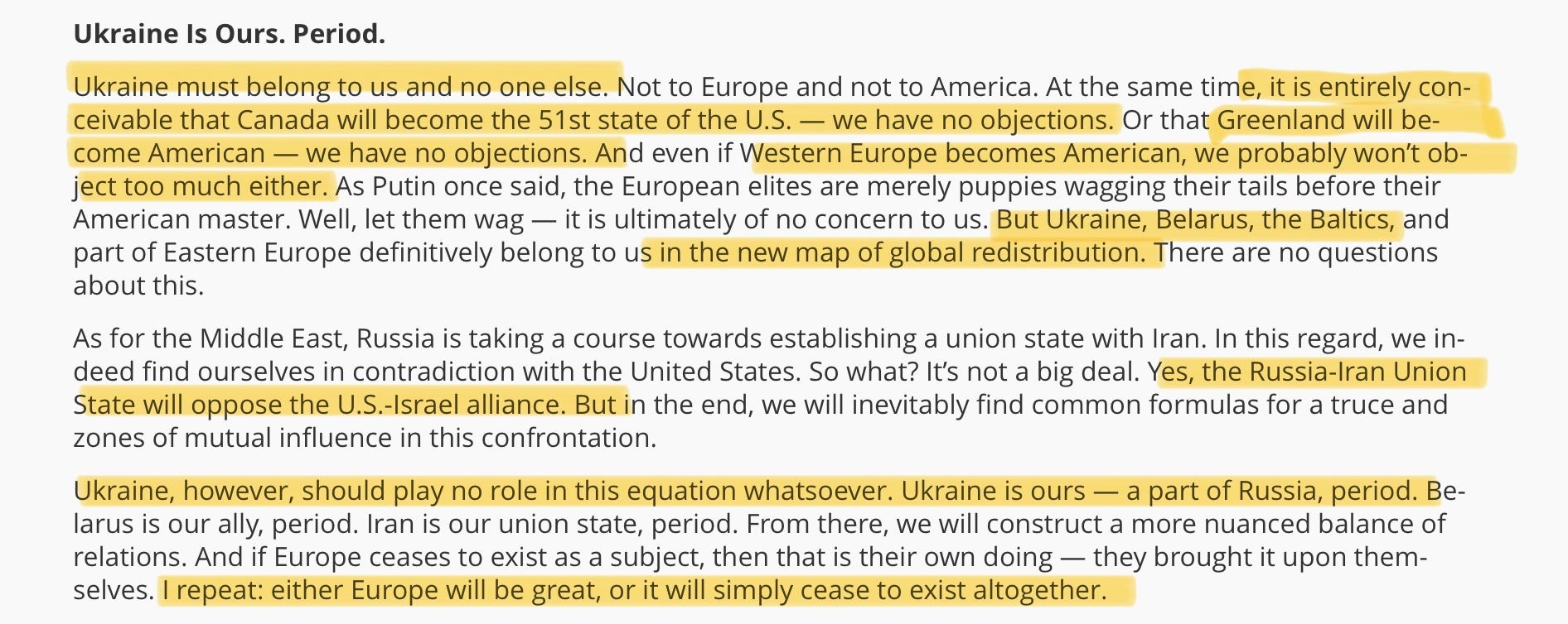 “the collective West as an entity simply no longer exists. Instead, there are now the United States — Great America… Europe must be brought in line with the broader multipolar model to which both Trump and Putin agree. As do Xi Jinping, the great ruler of Great China, and Modi, the great ruler of Great India. Therefore, Europe must either become great, or it will cease to exist altogether, and we will forget about it.”