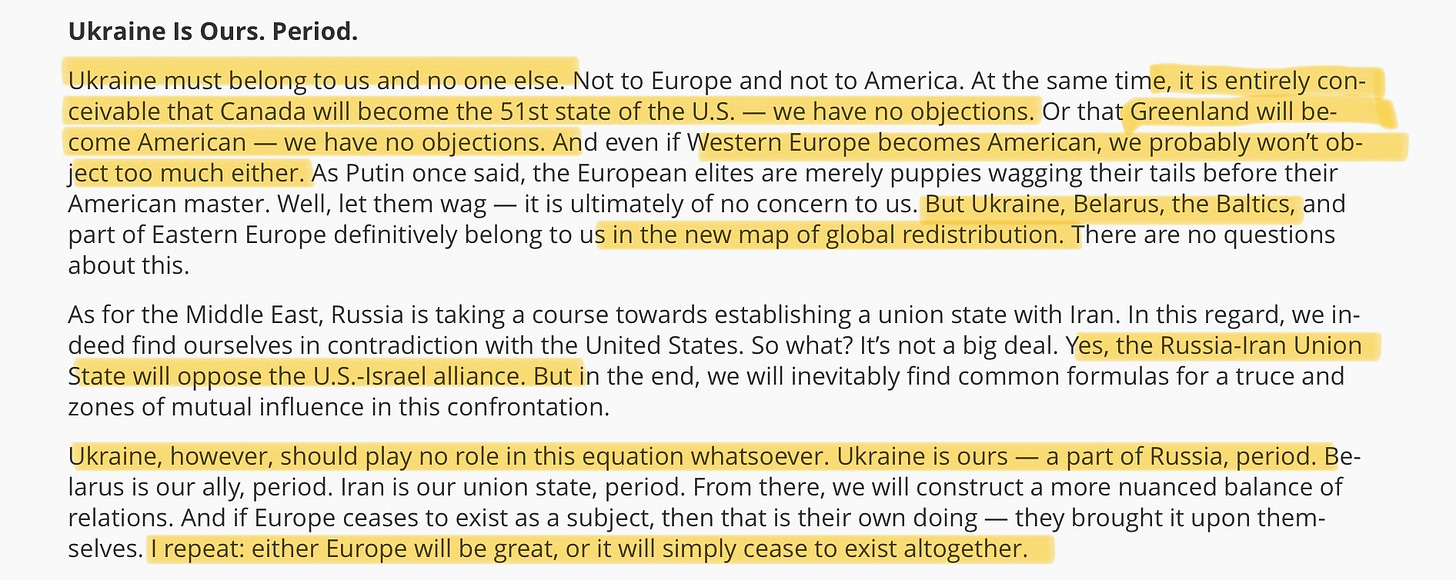 “Ukraine must belong to us and no one else. Not to Europe and not to America. At the same time, it is entirely conceivable that Canada will become the 51st state of the U.S. — we have no objections. Or that Greenland will become American — we have no objections. And even if Western Europe becomes American, we probably won’t object too much either.“