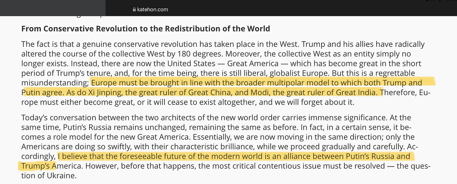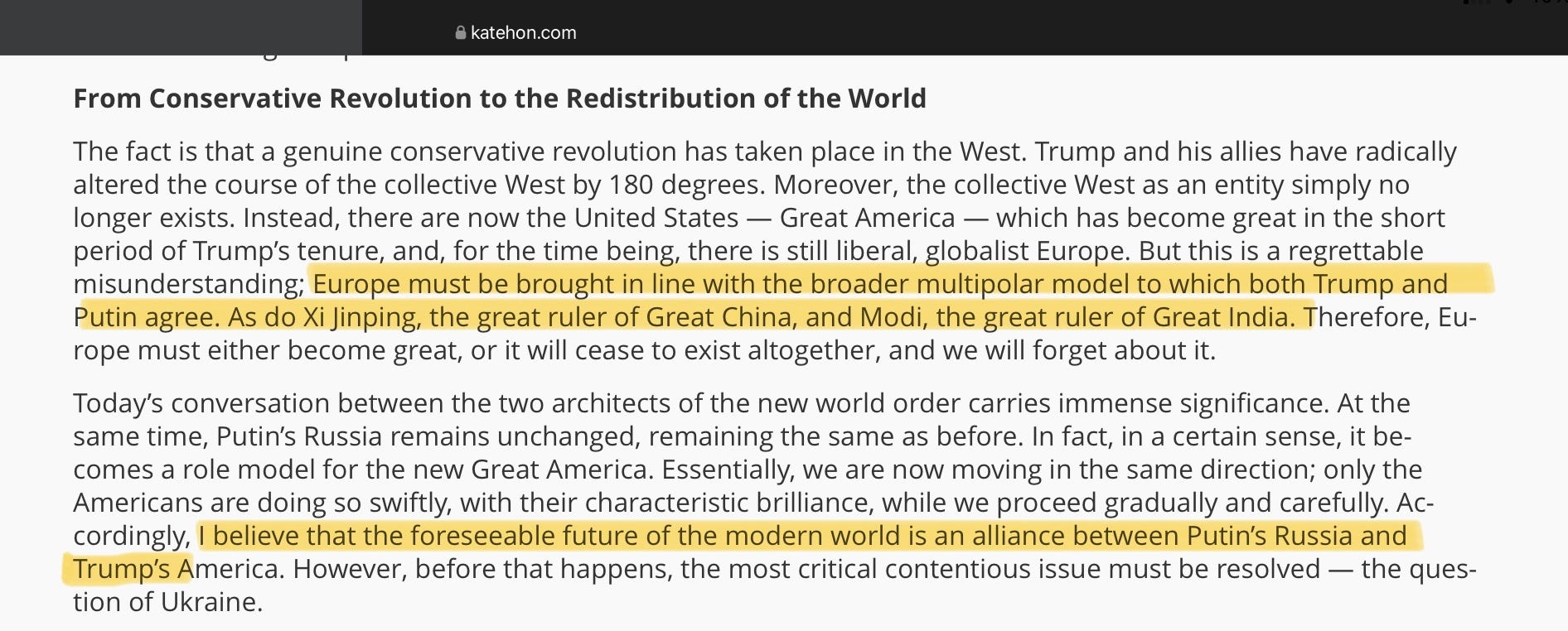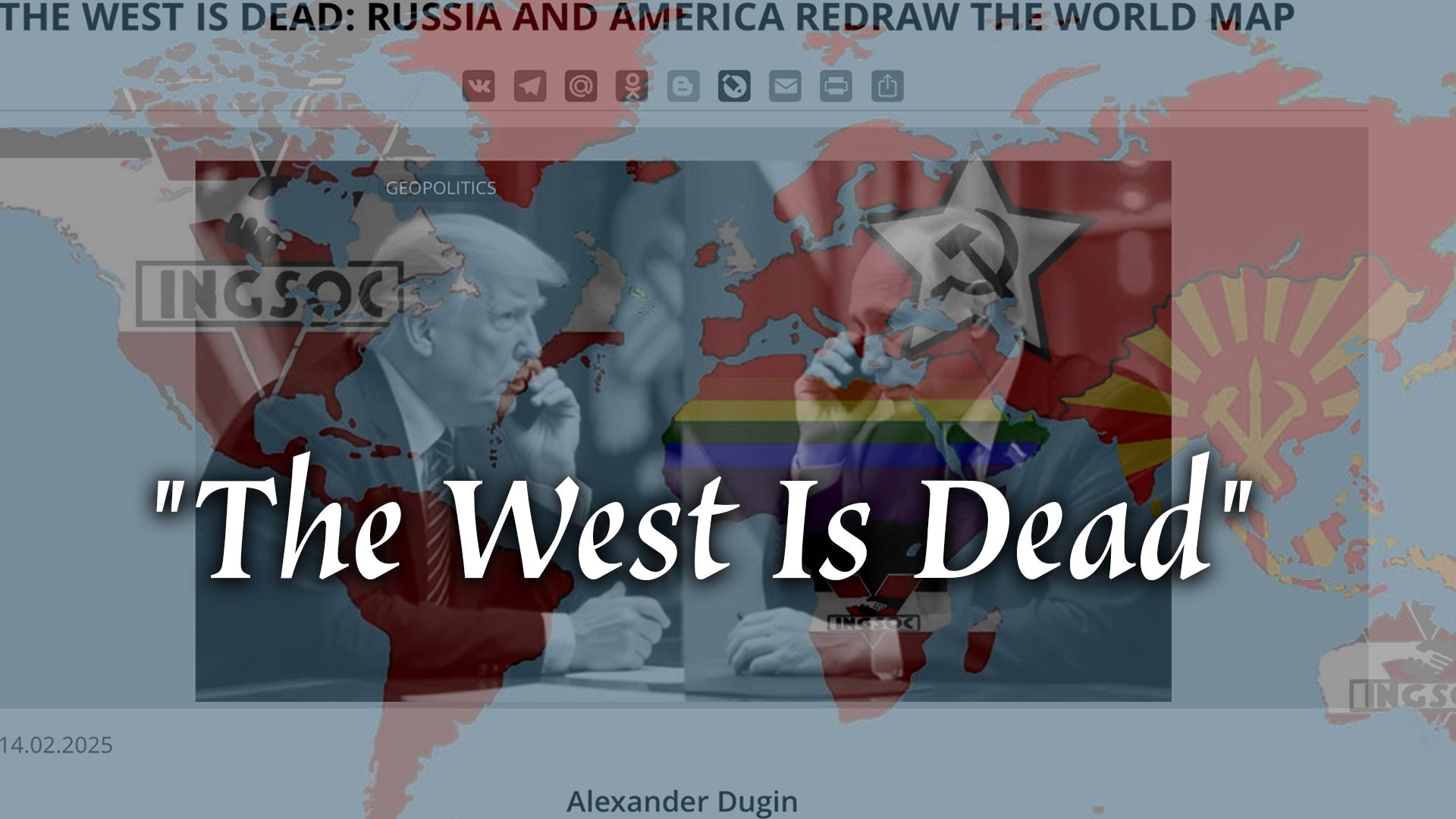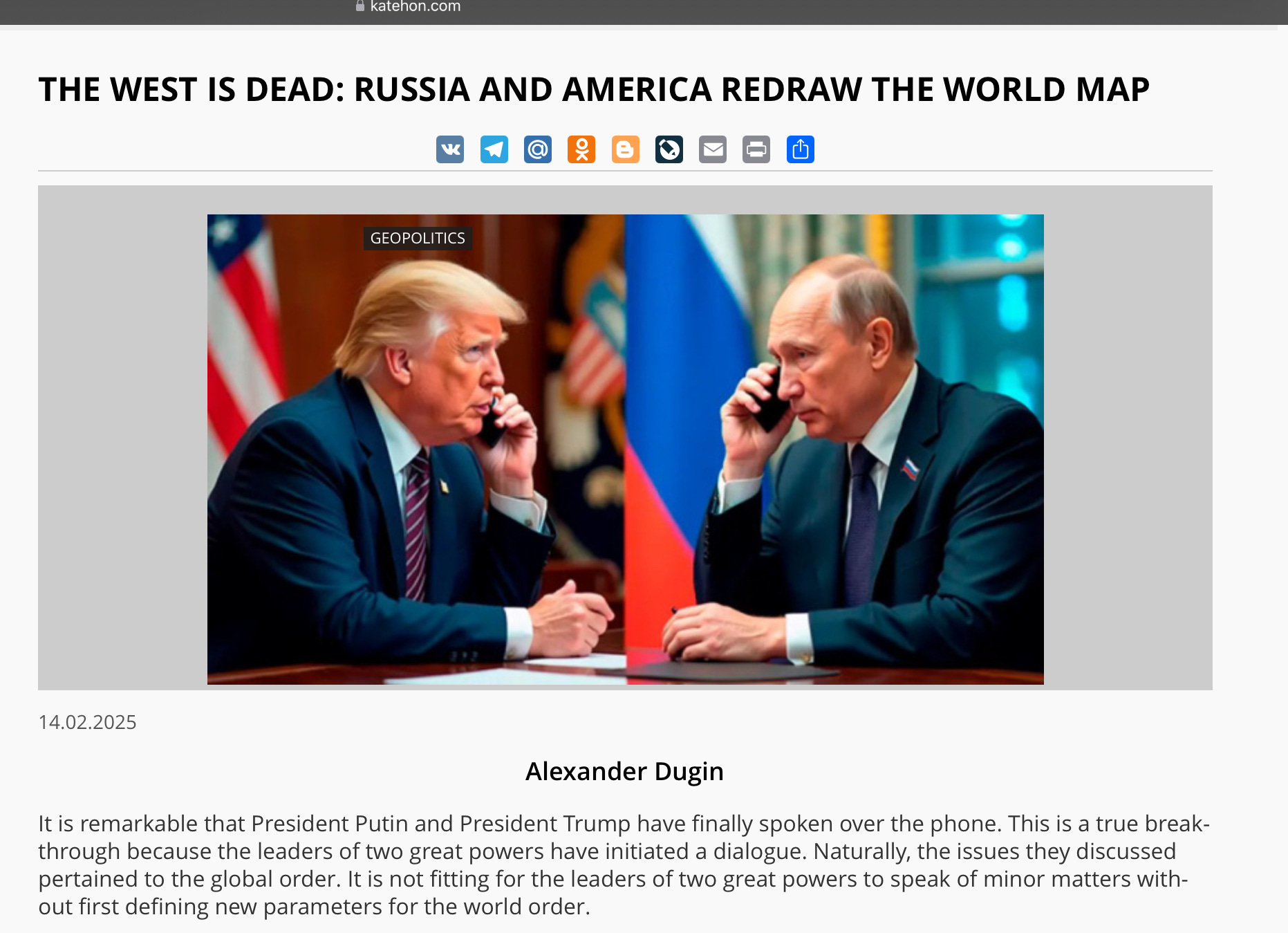 Yesterday, Dugin published an article called “The West Is Dead: Russia and America Redraw the World Map” in which he describes the recent conversation between Putin and Trump as “defining new parameters for the world order.”