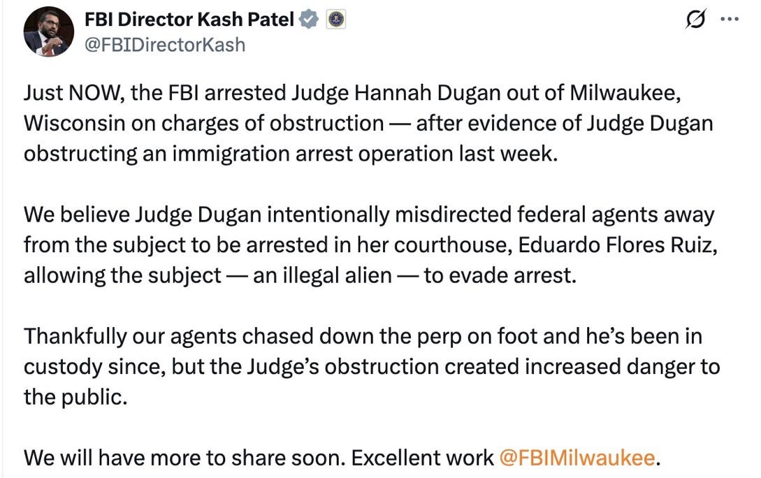 This morning, the Director of the FBI Kash Patel gleefully announced on Twitter/X that he had arrested a judge for obstruction in an immigration case, then deleted it.