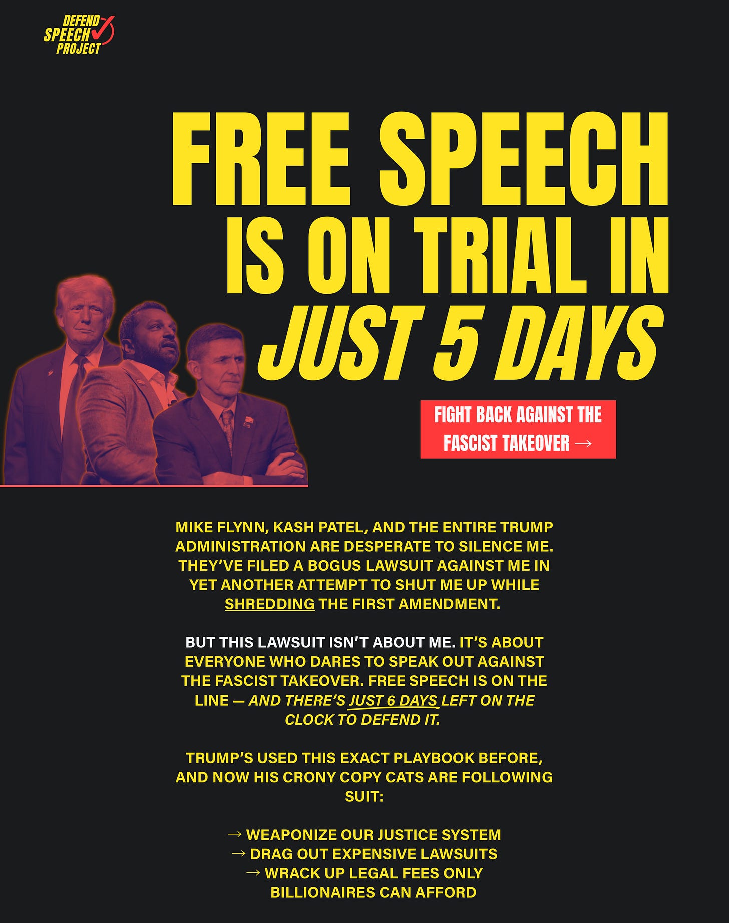 We have set up a 501c4 non-profit called the Defend Speech Project—DefendSpeechNow.org—that will be used defend anyone whose free speech rights are being trampled. No pressure, but if you can afford to help, it’s greatly appreciated.