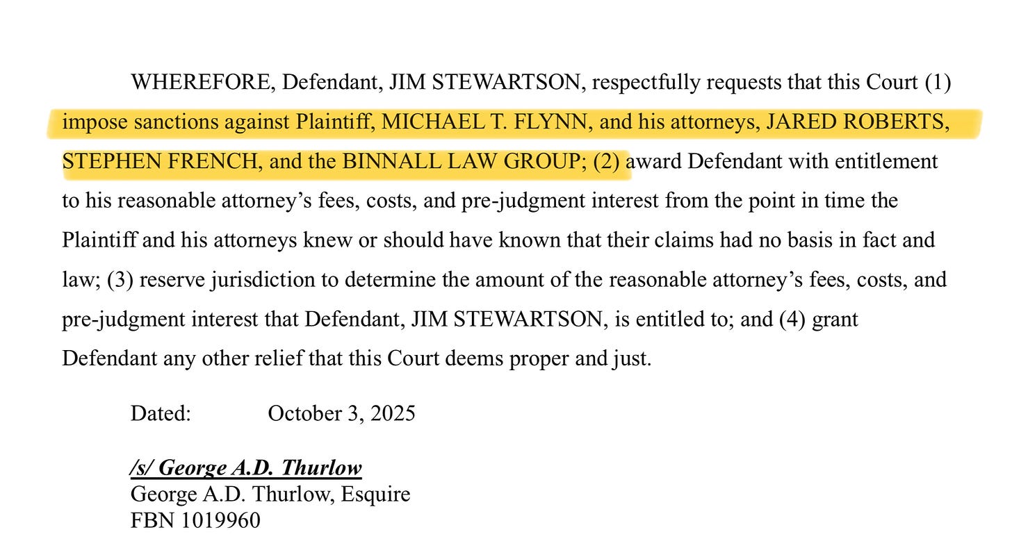 But Mike Flynn not only has no case, he and his lawyers are racking up costs. After our respective depositions, which went very well for me, my attorneys filed a request for sanctions from the judge—and a demand to Flynn’s attorneys that they drop their case.