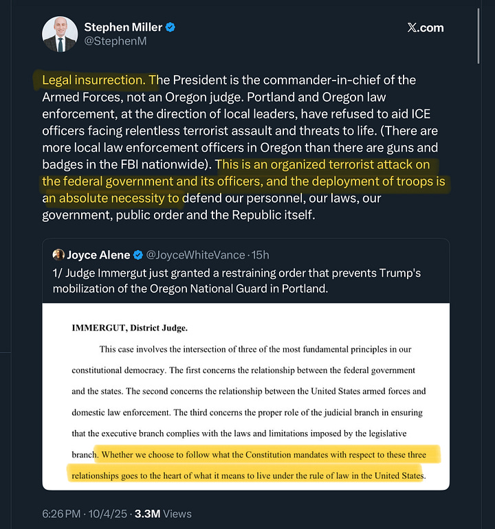 It’s not a question of whether the regime will try to officially void the U.S. Constitution, it’s just a question of how and when. To give a sense of how committed they are to this project, last night a Trump-appointed judge gave a scalding rebuke of the regime‘s effort to call up Oregon National Guard.