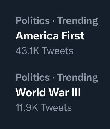 I saw “World War III” trend along with “America First” and decided to inject a bit of truth into the flow. For the most part, the tweets in the trend are Kremlin propaganda, but this was the top tweet (in the top trend) for several hours and still going very strong.