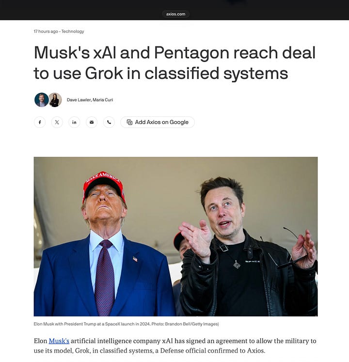 Trump and Pete Hegseth are doing their best to help with Musk’s problem, recently giving Musk’s chatbot Grok—a dangerous, unstable, and deliberately racist product—access to U.S. military classified systems.