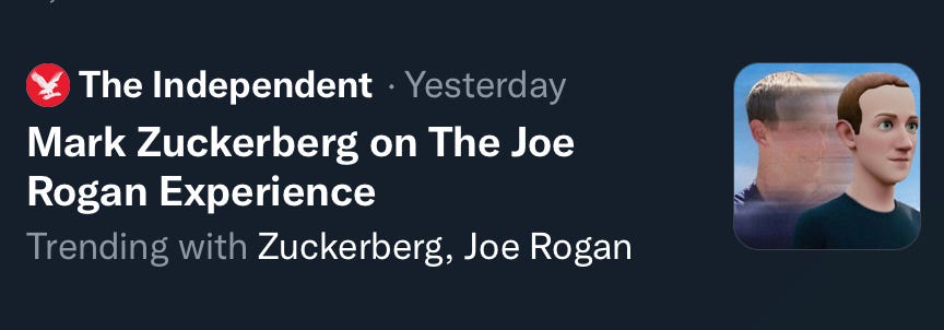 Joe Rogan is part of the “Intellectual Dark Web” which is Peter Thiel’s QAnon for rich white people. Mark Zuckerberg going on his show is just dropping the fig leaf for what we’ve known all along — he’s just another psychopath who wants the world to burn.