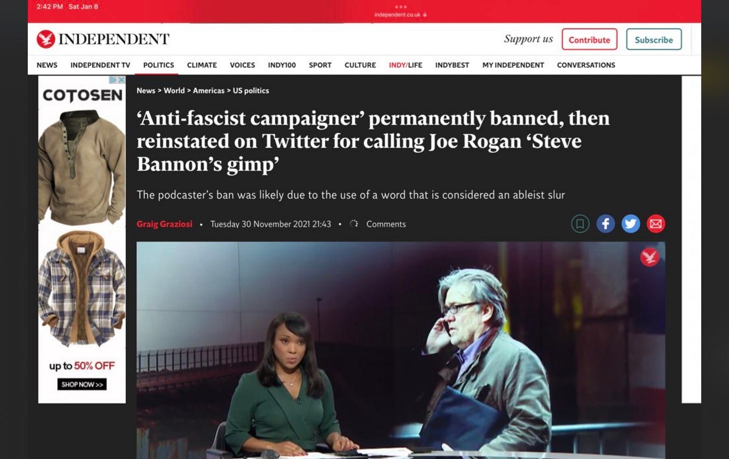 ICYMI, the first time I was inauthentically banned from Twitter was because I said Joe Rogan is “Steve Bannon’s gimp.” This happened hours before Jack Dorsey stepped down.