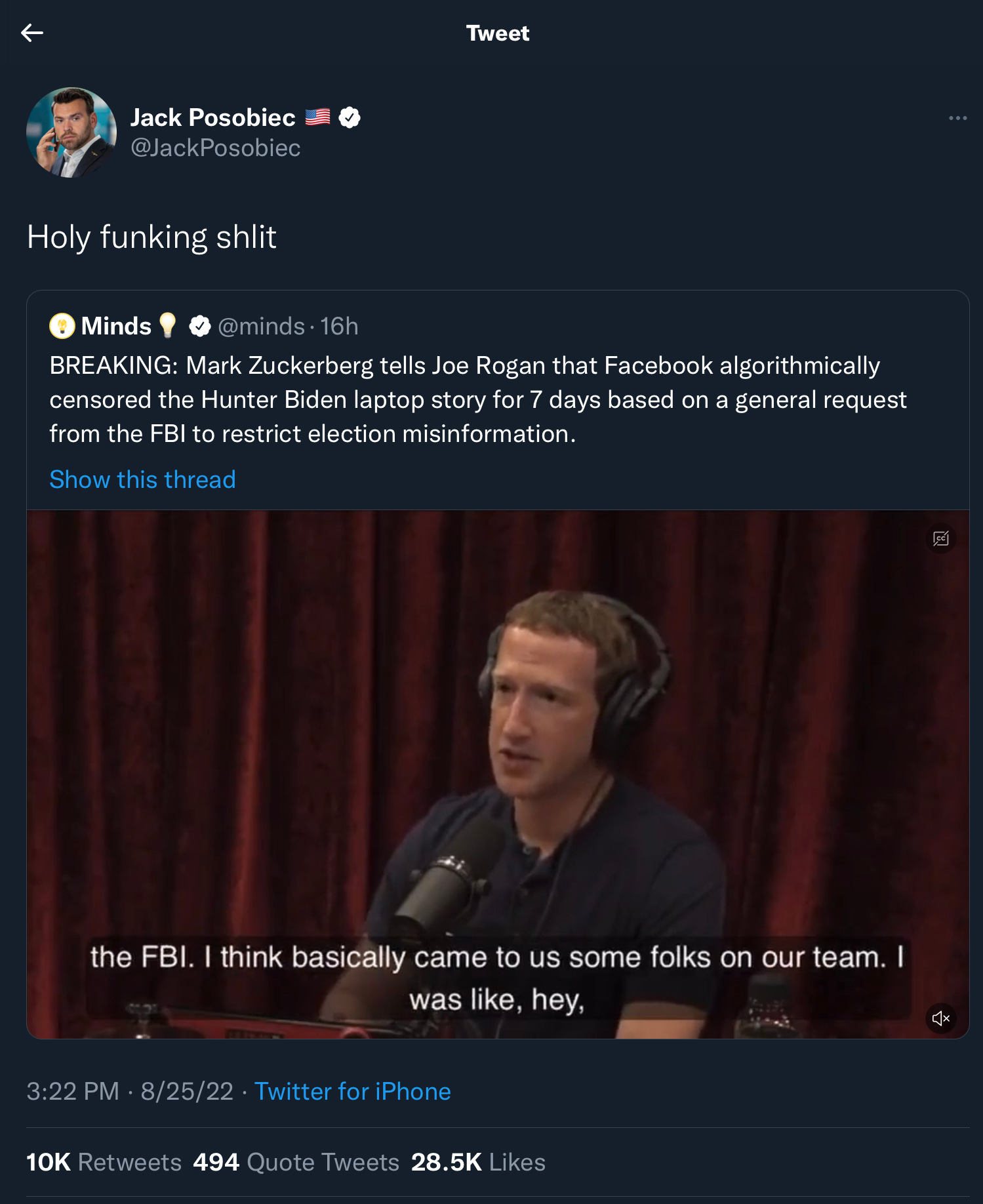 Now Zuck is not just doing it through his trash platform, he’s validating neo-nazi, anti-vax, woo woo, fascist fuckwit Joe Rogan’s show to generate propaganda about Hunter Biden’s Fucking Laptop.